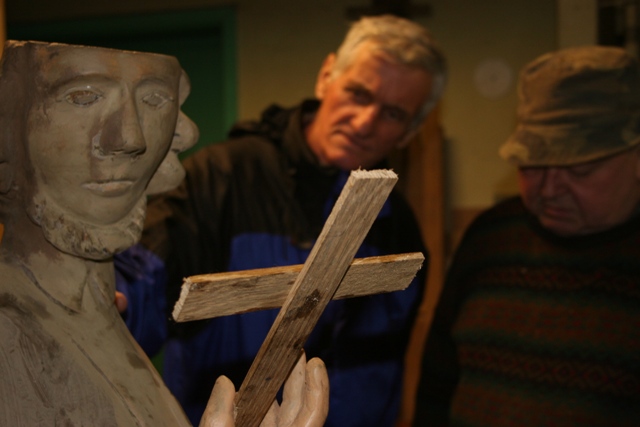 Prace nad rekonstrukcją starej rzeźby trwają. Na ukończeniu jest odrestaurowanie zniszczonych elementów. Pozostaje wykonanie krzyża i palmy, które to Św. Jan trzyma w rękach i rzeźba zostanie przewieziona do malowania. Na zdjęciach Ksiądz Proboszcz ocenia efekty prac rzeźbiarskich i model mającego powstać krzyża. /BN/