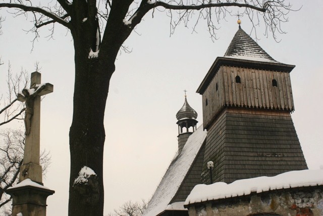W zimowe popołudnie wybrałem się do dzielnicy Gliwic – Ostropy odwiedzić stary drewniany kościół. W ramach projektu renowacji tego kościoła rozebrano zupełnie jego część drewnianą, po czym montowano ją na nowo, w większości z nowego już drewna. Ten stary- nowy kościół jest w fazie trwającej rekonstrukcji. O jego XV-wiecznej historii mówi krótko tablica informacyjna. Stosunkowo niedawno (w 2002 roku, ze środków Wojewódzkiego Oddziału Służby Ochrony Zabytków) wyremontowano kamienny postument z krzyżem z 1831 roku. Jego ozdobą są wymowne rzeźby o autentycznym ludowym charakterze. Wspaniały, gruboziarnisty piaskowiec jest tu dla nich pięknym tworzywem. Szkoda, że otoczenie - betonowy słup elektryczny, rozsypująca się elewacja postumentu i zrujnowane ogrodzenie terenu kościelnego tak bardzo kontrastują z tym zabytkiem.